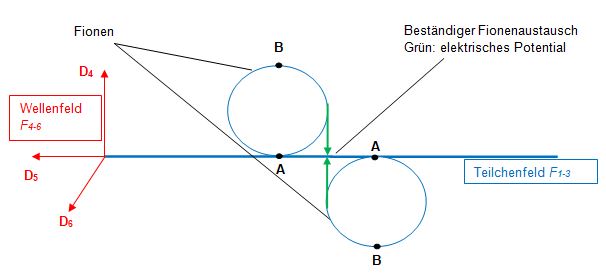 Durch die Rotation beider Teilimpulse mit Spin 1, eines oberhalb und eines unterhalb der Dimensionsebene D56 bildet das Universum sein elektrisches Spannungspotential aus. Die photonische Trennung wäre mit zwei geladenen Kondensatorplatten vergleichbar. Durch die zeitabhängige Expansion wirkt das veränderliche Spannungspotential wie ein Verschiebungsstrom mit seinem orthogonal ausgerichteten Magnetfeld. Im Wellenfeld F4-6 erzeugt der Verschiebungsstrom eine elektrische Feldwirkung parallel zur vierten Raumdimension D4. Die elektrostatische Trennung erfolgt durch die Dimensionsebene D56. Mit dieser Geometrie wird den Ladungsträgern eine Ladung zugeschrieben oder begründet, warum keine Ladung vorliegt. Im Anfangsstadium des Universums liegt das elektrische Potential (wie auch das Gravitationspotential) maximal an und strebt bis zu seiner maximalen Ausdehnung auf sein Minimum zu.