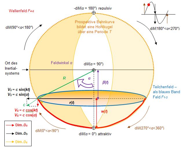 Die obige Darstellung zeigt über die Geschwindigkeitsvektoren die Momentaufnahme einer Raumzeitdeformation. Dies entspricht der speziellen Betrachtung der Relativitätstheorie für die Feldraummechanik. Läuft die Nominalzeit t weiter, dann entsteht durch diese trigonometrische Darstellung ein periodischer Zusammenhang, in welchem die Geschwindigkeitsvektoren V4 und V5 kontrahieren und expandieren. Diese Dynamik entspricht der allgemeinen relativistischen Betrachtung.